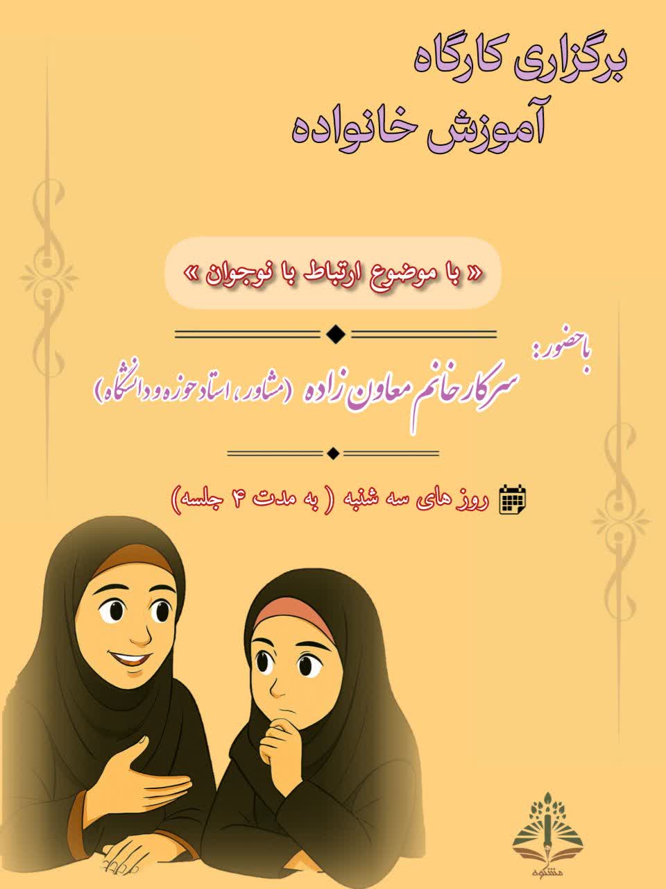 کارگاه آموزش خانواده با موضوع ارتباط با نوجوان در روزهای سه شنبه به مدت 4 جلسه (شروع از دوم دی ماه 1404) در متوسطه دوم مشکوه برگزار میشود. استاد دوره سرکار خانم معاون زاده (مشاور و استاد حوزه و دانشگاه) میباشند.